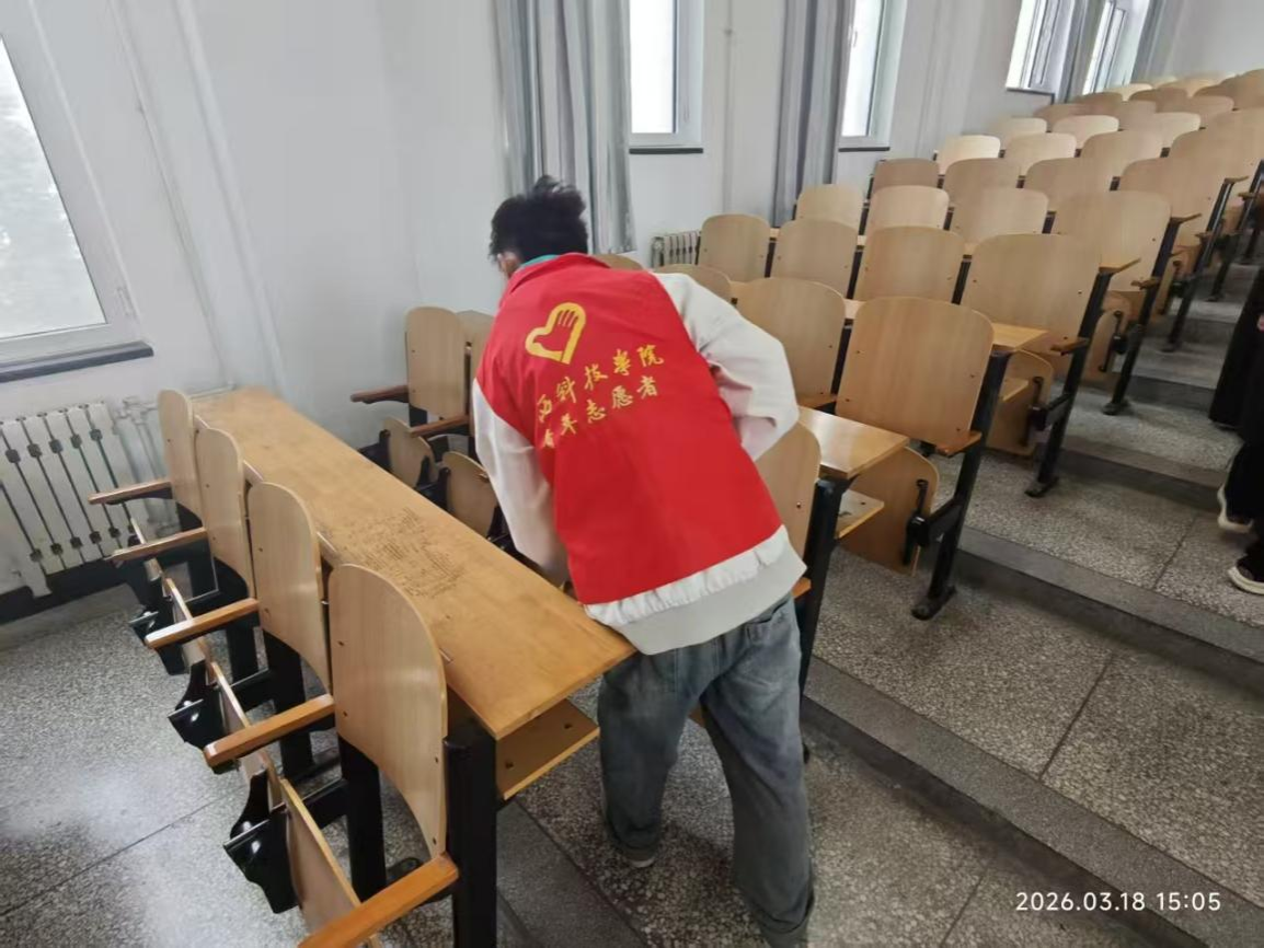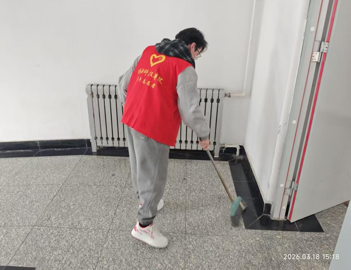活动伊始,同学们便在负责人统筹下迅速集结、分工协作,大家手持扫帚、簸箕、抹布等工具,以饱满的热情投身校园环境整治:在教学楼里,志愿者们俯身擦拭每一张课桌椅、仔细拂去桌面尘渍,细致清扫地面纸屑杂物,连桌角、墙角等卫生死角都逐一清理到位;在楼道走廊间,大家弯腰清扫边角积灰、规整摆放零散杂物,用双手为师生创造整洁舒适的学习生活空间。劳动中,同学们相互配合、干劲十足,不怕脏累的身影成为校园里最温暖的风景线,生动诠释了新时代青年乐于奉献、勇担使命的青春风貌。