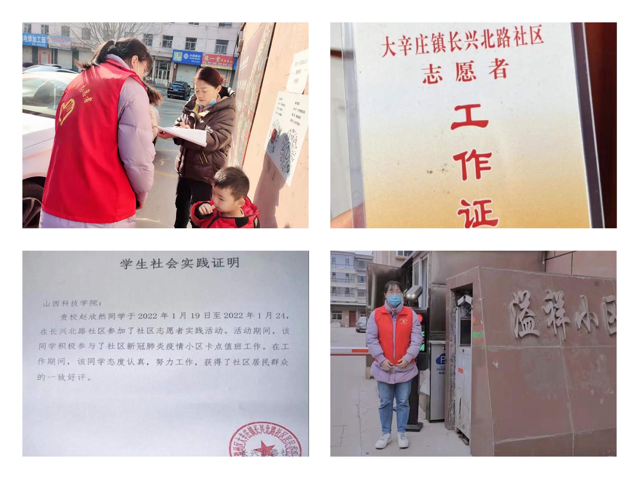 她在寒假期间参加“2022年青春兴晋”返乡大学生寒假社会实践活动。作为大学生,她挺身而出,主动请战,为这场疫情防控阻击战注入强大的新生力量,帮助社区卡口人员共同开展疫情防控工作,讲奉献,勇担当,填补了疫情防控人员人手短缺的问题,肩负起人员出入登记、体温监测、人员排查、值班等各项任务,同时参加了疫情防控应急处置演练,在本社区的公开事务群中进行防控知识宣传,提醒社区人员非必要不外出,出入做好防护。