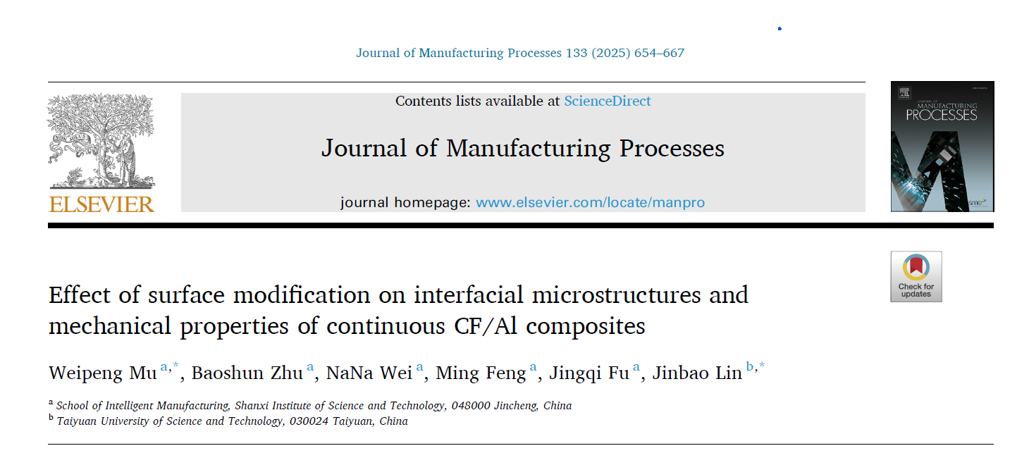 我院青年教师牟维鹏博士在国际著名学术期刊《Journal of Manufacturing Processes》(中科院1区top)发表题为“Effect of surface modification on interfacial microstructures and mechanical properties of continuous CFAl composites”的研究性论文。该论文以英国上市官网365为通讯单位。